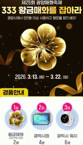 추첨을 통해 333만 원 상당의 황금매화(2명)를 비롯해 갤럭시탭, 갤럭시워치 등 다양한 경품이 제공된다.
