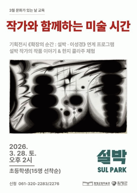 함평군은 “함평군립미술관에서 전시 중인 기획전시 《확장의 순간: 설박·이성경》 출품 작가와 함께하는 미술 교육 프로그램인 ‘작가와 함께하는 미술 시간’을 운영한다”고 11일 밝혔다.