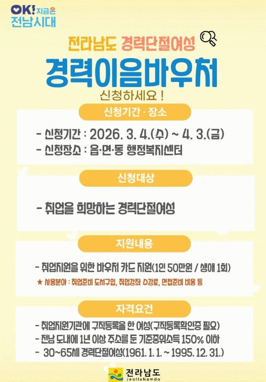 지원 대상은 취업지원기관(여성새로일하기센터, 고용복지플러스센터 등)에 구직을 등록한 30세부터 65세 이하 여성으로 신청일 기준 전라남도에 1년 이상 주소를 두고 있으며 전월 건강보험료가 기준 중위소득 150% 이하인 경우다.