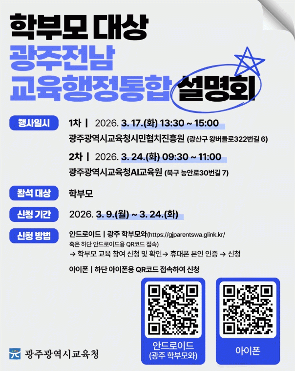이정선 교육감은 “광주‧전남 교육행정통합은 미래 교육환경 변화에 대응하기 위한 중요한 과정”이라며 “이번 설명회를 통해 학부모와의 소통을 강화하고 현장의 의견을 수렴해 교육행정통합 정책 추진 과정의 민주성과 투명성을 높아질 것으로 기대한다”고 밝혔다.