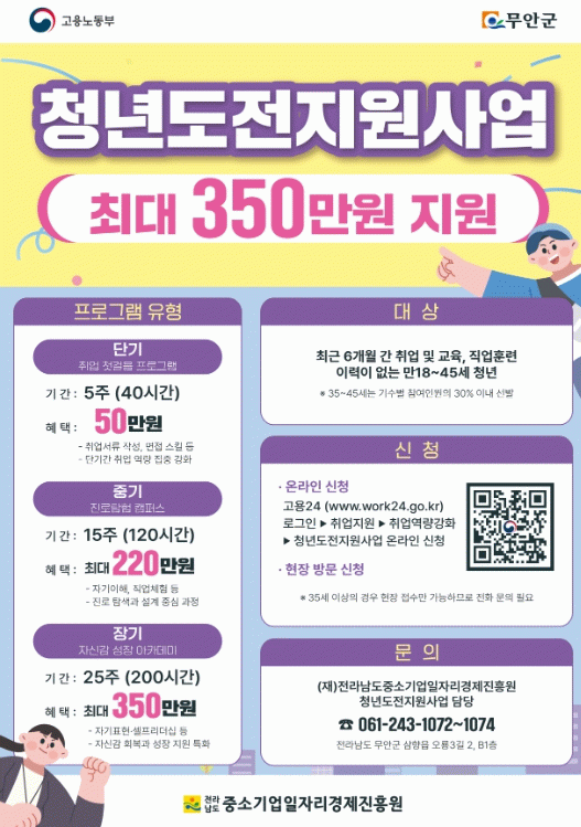 모집은 예산 소진 시까지 상시 진행되며 신청은 고용24 누리집 또는 전남일자리종합센터(무안군 삼향읍 오룡3길 2)를 방문해 할 수 있다.