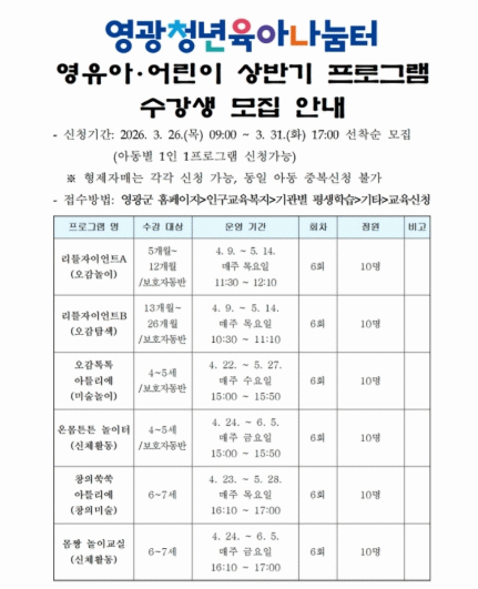 영광군 관계자는 “이번 상반기 프로그램이 아이들에게 즐겁고 유익한 배움의 시간이 되고, 보호자들에게도 만족도 높은 돌봄·놀이 프로그램이 되길 바란다”며 “앞으로도 영광청년육아나눔터를 중심으로 아이 키우기 좋은 환경 조성을 위해 다양한 프로그램을 지속적으로 운영해 나가겠다”고 말했다.