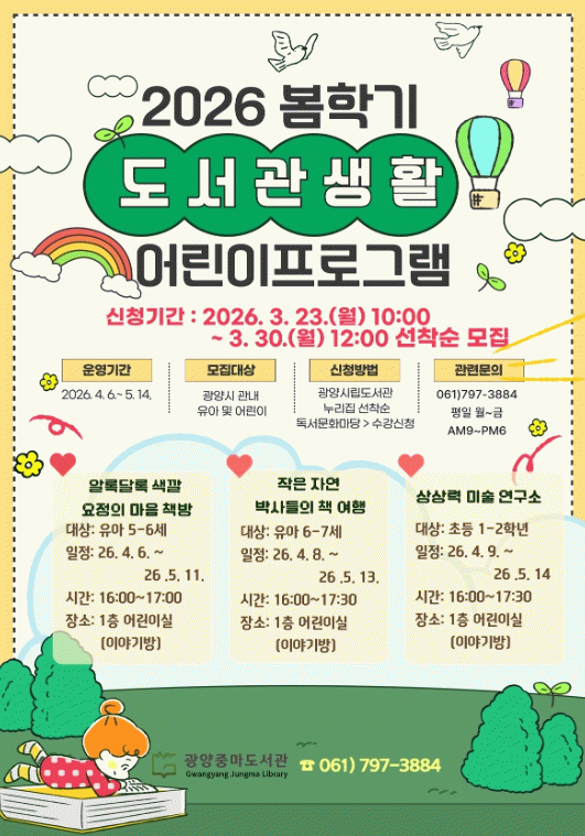 수강 신청은 3월 23일 월요일 오전 10시부터 3월 30일 월요일까지 광양시립도서관 누리집을 통해 선착순으로 받으며, 신청은 반드시 수강생 본인 이름(아이디)으로 해야 한다.