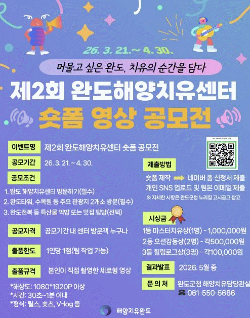 숏폼에는 완도해양치유센터 체험과 함께 완도 주요 관광지 2개소 이상을 방문한 영상이 담아야 하며, 개인·팀당 1점을 출품할 수 있다.