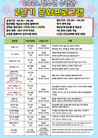 프로그램은 4월 16일부터 6월 28일까지 진행되며, 화순군에 주소를 둔 청소년이면 누구나 참여할 수 있다. 4월 4일부터 4월 9일까지 화순군청소년수련관 누리집에서 ‘프로그램 신청 게시판’을 통해 온라인으로 신청 가능하다.