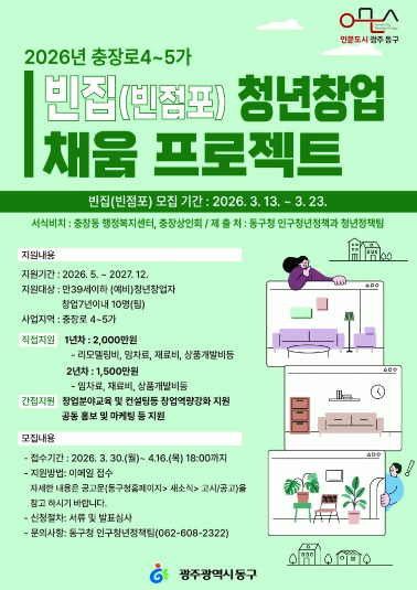 동구는 이러한 정책의 일환으로 충장로 4·5가 일대 빈 점포를 활용한 ‘2026년 빈집 청년창업 채움 프로젝트’를 본격 추진한다. 이번 사업은 유휴 점포를 청년 창업공간으로 재생해 지역 상권에 활력을 불어넣고, 청년들에게는 안정적인 창업 기반을 제공하는 것을 목표로 한다.