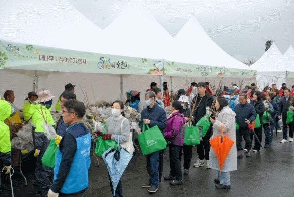 이번 행사는 전라남도, 순천국유림관리소, 순천농협, 순천시산림조합과 협력하여 마련됐으며, 대추·살구·자두·복숭아 등 과실수와 황칠, 서향(천리향), 미니화분 등 총 7종 21,000주의 묘목을 준비해 순천시민 3,000명에게 1인당 7주씩 배부했다.