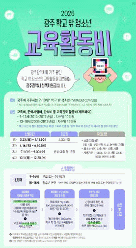 지원 대상은 광주광역시에 주민등록을 두고 거주하는 9~18세 학교 밖 청소년이며, 연령에 따라 차등 지원된다.