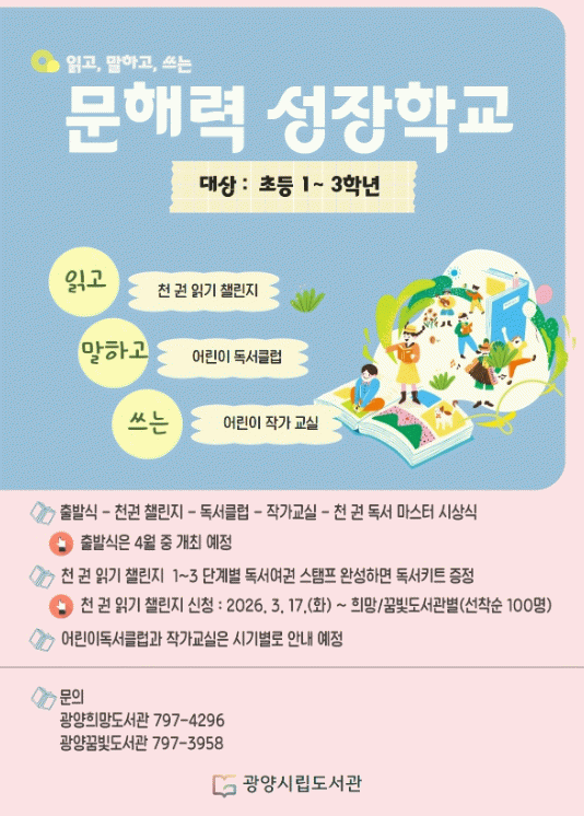 한편, 문해력 성장학교 '천 권 읽기 챌린지'는 3월 17일부터 광양시립도서관 누리집에서 광양희망도서관과 광양꿈빛도서관 각각 선착순 100명을 모집한다. 자세한 사항은 광양희망도서관(☎061-797-4296), 광양꿈빛도서관(☎061-797-3958)으로 문의하면 된다.