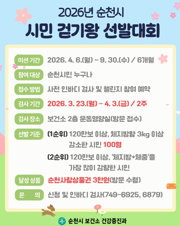 이번 걷기왕 선발대회는 사전·사후 인바디 검사를 포함해 3월 23일부터 10월 28일까지 약 8개월간 진행되며, 스마트폰 걷기 앱 ‘워크온’ 순천시 커뮤니티 가입 시민을 대상으로 참여 신청을 받는다.
