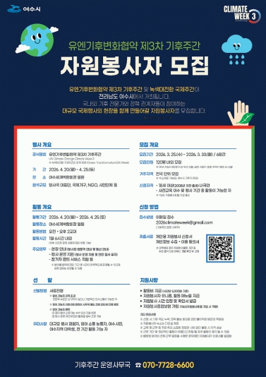 이번 행사는 198개 유엔기후변화협약 당사국 정부 대표를 비롯해 국제기구 관계자와 국내외 기후 전문가 등이 참여하는 국제회의다. 시는 원활한 운영을 위해 영어 가능자와 일반 지원 인력을 선발해 현장에 배치할 계획이다.