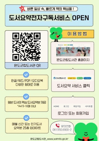 군민이면 누구나 스마트폰과 PC를 통해 언제 어디서든 편리하게 이용할 수 있으며, 신청은 완도군립도서관 홈페이지를 통해 하면 된다.