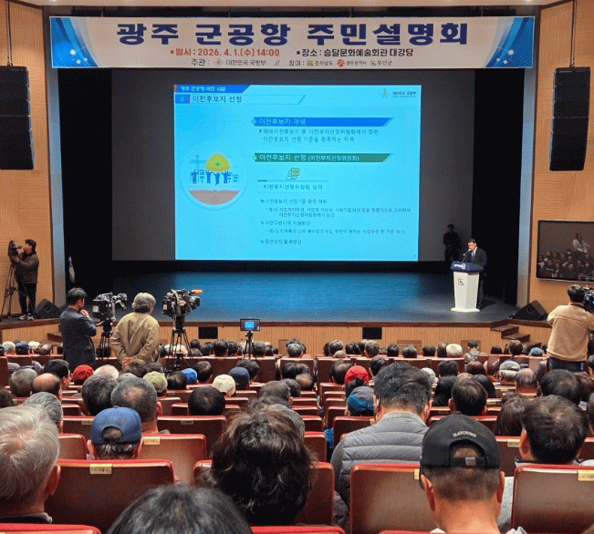 군민 500여 명이 참석한 이날 설명회에선 ▲군공항 이전사업 절차 ▲광주공항 국내선 이전 ▲이전주변지역 지원사업 ▲정부 차원 지원사업 등 군공항 이전과 관련한 핵심 현안이 다뤄졌다.