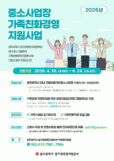 ‘가족친화경영 지원사업’은 중소사업장의 가족친화문화 정착과 일·가정 양립 확산을 위해 광주시가 지난 2019년 전국 최초로 도입했다. 이 사업은 단순한 제도 시행에 그치지 않고 현장에서의 운영 과정을 실질적으로 지원하는 것이 특징이다.