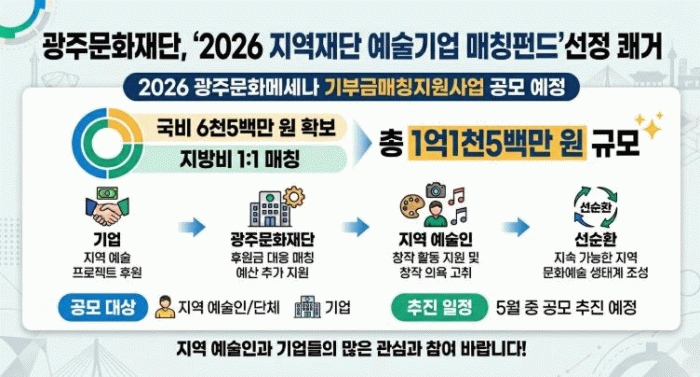 이에 따라 오는 5월, 지역 예술인과 기업을 대상으로 ‘2026 광주문화메세나 기부금매칭지원사업’ 공모를 시행할 예정이다.