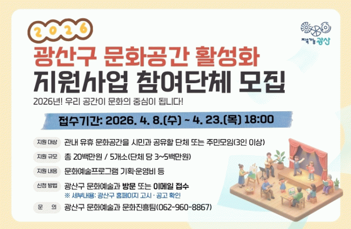 광산구 관계자는 “이번 사업은 유휴 문화공간의 새로운 가능성을 발굴하고, 시민이 문화를 매개로 소통하며 관계를 회복하는 일상의 거점을 확충하는 시도가 될 것”이라며 “공간의 문을 활짝 열어 문화예술의 즐거움을 함께 나눌 단체들의 많은 참여를 바란다”라고 밝혔다.
