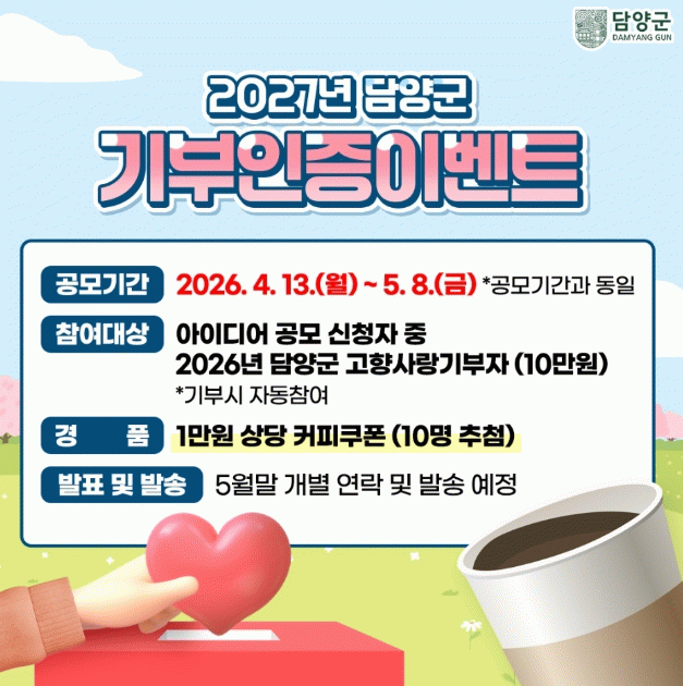 담양군 고향사랑기부제에 관심 있는 국민 누구나 참여할 수 있으며, 아이디어 제안서는 이메일, 군청 홈페이지, 우편을 통해 제출할 수 있다. 접수된 아이디어는 관련 부서 검토와 기금운용심의위원회 심사를 거쳐 오는 7월 중 최종 선정될 예정이다.