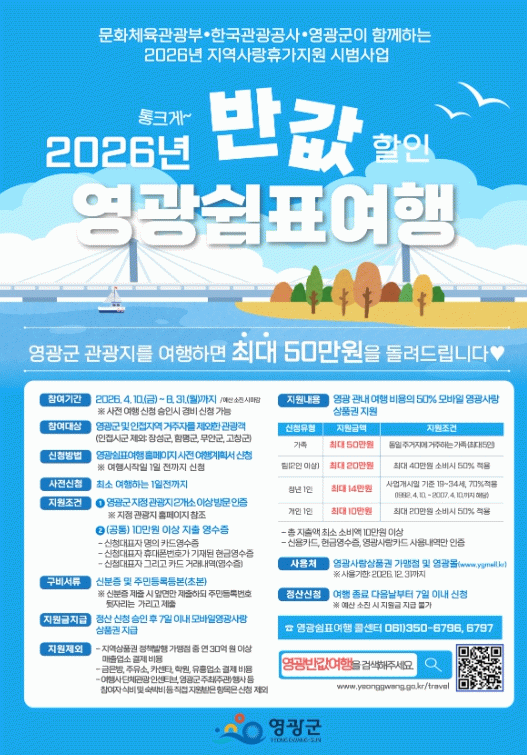 체류형 관광 및 지역경제 활성화를 위한 이번 사업은 신청 첫날 영광 쉼표여행 누리집에 순간 접속자가 폭주해 접속이 지연되기도 했지만, 타 지역 관광객들의 높은 관심 속에 신청은 빠르게 마감됐다.