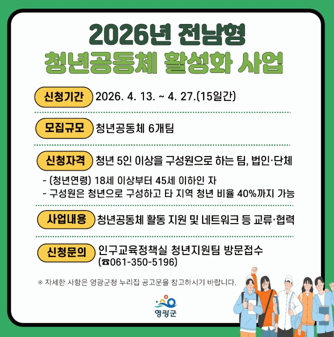 영광군 관계자는 “지난해 전라남도 청년공동체 성과공유회 최우수상 수상을 통해 우리 군 청년들의 우수한 역량을 입증한 바 있다”며, “올해도 청년들의 창의적인 활동이 지역사회에 실질적인 변화와 활력을 가져올 수 있도록 적극 지원하겠다”고 말했다.