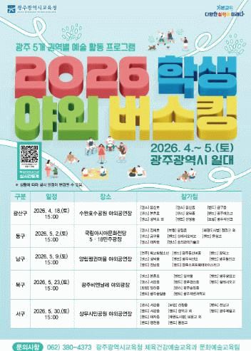 올해 ‘학생 야외버스킹’은 ▲18일 오후 3시 광산구 수완호수공원 야외공연장 공연을 시작으로 ▲5월 2일 오후 3시 동구 국립아시아문화전당 5·18민주광장 야외무대 ▲5월 9일 오후 3시 남구 양림 펭귄마을 야외공연장 ▲5월 23일 오후 3시 북구 비엔날레 야외광장 ▲5월 30일 오후 3시 서구 상무시민공원 야외공연장등 5개 자치구에서 각 한 차례씩 총 5번 운영된다.