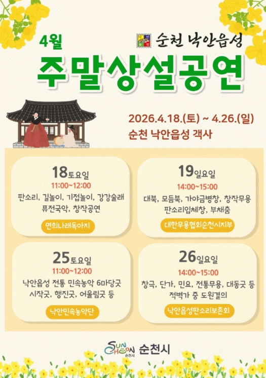 남녀노소 누구나 함께 즐길 수 있는 공연을 통해 낙안읍성을 찾는 관람객들에게 특별한 주말을 선사할 것으로 기대된다.