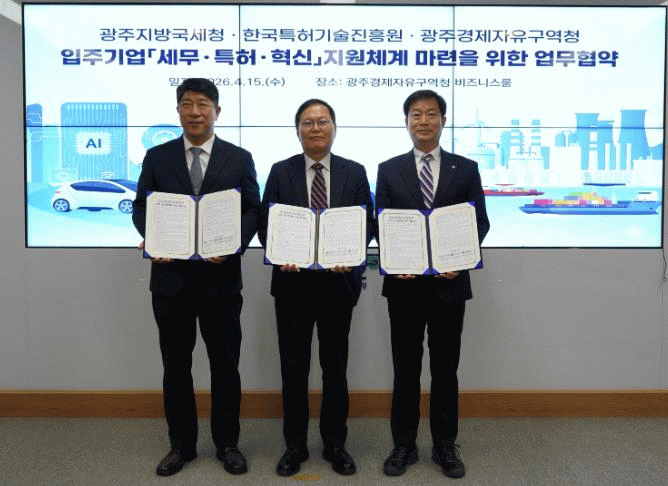 이날 협약식에는 선석기 광주경자청장, 김학선 광주지방국세청장, 김명섭 한국특허기술진흥원장이 참석해 지역 기업의 혁신 성장을 위한 협력체계 구축에 뜻을 모았다.