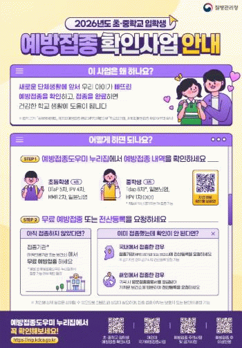 중학교 입학 전에는 ▲일본뇌염 ▲Tdap 6차 ▲HPV 1차(여학생) 접종을 완료해야 한다.
