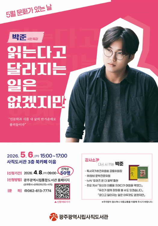 조인숙 사직도서관리장은 “박준 시인의 조용하지만 깊은 언어가 시민 일상에 작은 위로와 여백이 되길 바란다”며 “이번 강연이 문학을 통해 서로의 마음을 이어주는 따뜻한 시간이 되길 기대한다”고 말했다.