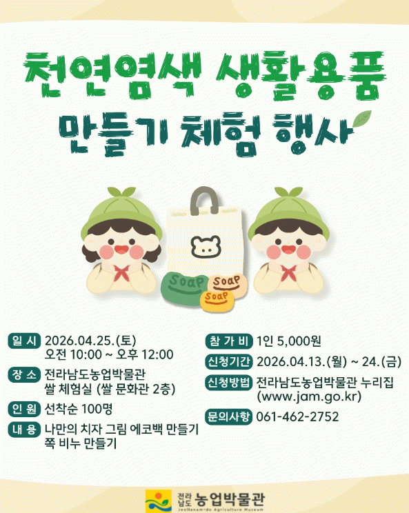 최병남 전남도농업박물관장 직무대리는 “전통의 색이 주는 따스함을 가족이 함께 느껴보길 바라는 마음으로 행사를 기획했다”며 “직접 만든 천연염색 소품을 통해 일상에서 농경문화의 가치를 새롭게 발견하는 즐거운 시간이 되길 기대한다”고 말했다.