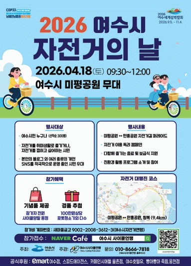 특히 ‘자전거 대행진’은 미평공원에서 출발해 옛철길공원 구간을 따라 만흥공원까지 왕복하는 9km 코스(약 80분 소요)로 운영되며, UNFCCC 기후주간과 2026여수세계섬박람회 성공개최를 기원하는 의미를 담았다.