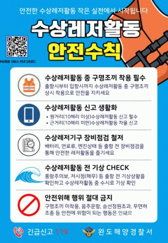 무상 점검을 희망하는 동력수상레저기구 소유주께서는 완도해양경찰서 교통레저계로 신청이 가능하다.