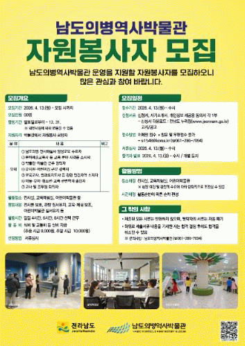 박중환 남도의병역사박물관장은 “박물관 자원봉사자로 활동하는 것은 지역 역사를 지키고 가꾸는 일에 주역이 되는 매우 뜻깊은 기회”라며 “이번 모집에 역량 있는 분들의 많은 관심과 참여 바란다”고 말했다.