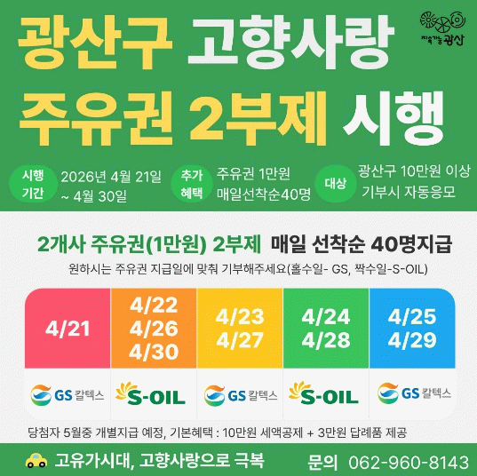 주유권 2부제 행사는 광산구에 10만 원 이상 기부한 기부자를 대상으로 매일 40명에게 선착순으로 주유권 1만 원을 지급한다.