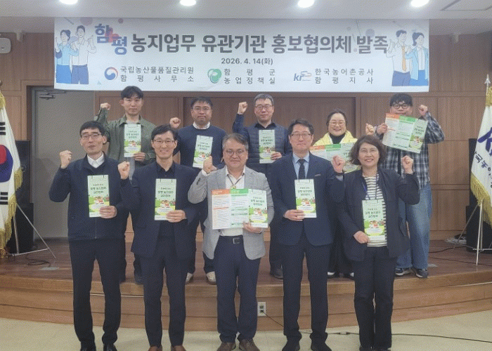 함평군은 20일 “함평군청과 국립농산물품질관리원 함평사무소, 한국농어촌공사 함평지사가 공동으로 지난 14일 한국농어촌공사 함평지사 대회의실에서 ‘농지업무 유관기관 홍보협의체’ 발족식을 개최했다”고 밝혔다.