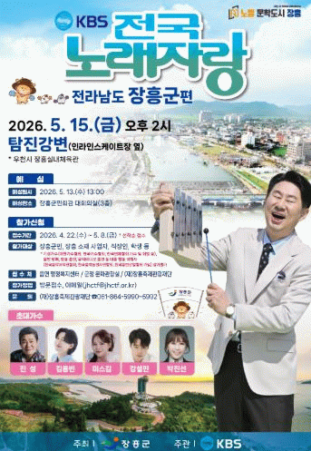 장흥군 관계자는 “이번 전국노래자랑은 군민이 함께 참여하고 즐기는 화합의 장이 될 것”이라며 “방송을 통해 장흥의 매력과 물축제를 전국에 알리는 계기가 되길 기대한다”고 말했다.