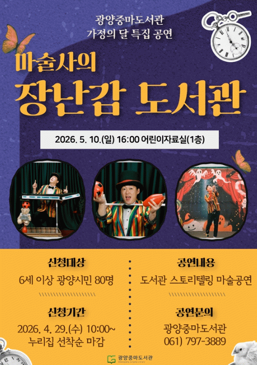 광양중마도서관 관계자는 “이번 공연이 아이들이 도서관과 더욱 가까워지고 책과 친숙해지는 계기가 되길 바란다”며 “가정의 달을 맞아 가족이 함께 웃고 공감하는 시간이 되길 기대한다”고 말했다.