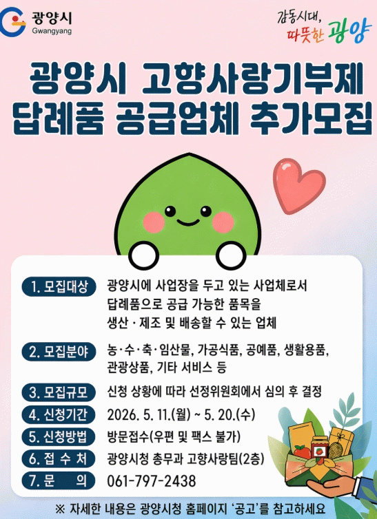 신청 대상은 광양시에 사업장을 두고 답례품 생산·제조 및 배송이 가능한 업체로, 온라인 등록과 판매를 위한 통신판매업 신고가 필요하다.