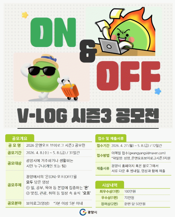공모 주제는 광양에서의 ‘온(ON)’과 ‘오프(OFF)’를 모두 담은 브이로그 영상이다.