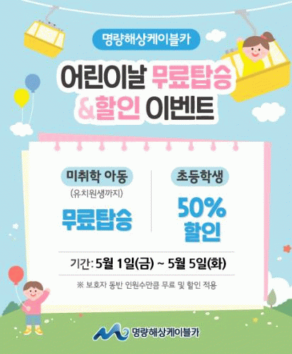 특히 전남 해남과 진도에 아이들이 좋아할만한 5월 축제들과 다양한 관광지가 있어 가족단위 관광객들에게 관심이 모아지고 있는데, 명량해상케이블카에서는 5월 1일부터 5일까지 5일간, 어린이 관광객들을 위한 깜짝 선물을 준비했는데, 기간동안 명량해상케이블카를 방문한 미취학 아동들에게는 케이블카를 무료로 탑승 및 초등학생에게는 기존 정상요금에서 50% 할인된 금액으로 케이블카를 이용할 수 있다.