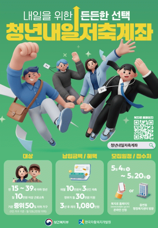 청년내일저축계좌는 일정 소득 요건을 충족한 근로 청년이 3년간 매월 10만 원 이상 저축하면 정부가 월 30만 원의 근로소득장려금을 추가 적립해주는 사업이다.