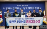 제갈대종 기자2025.11.26 17:29[호남미디어협의회]전남 무안군이 26일 광주광역시 염주체육관 내 올림픽기념국민생활관 1층 세미나실에서 열린 제17회 광주·전남 지방자치경영대상에서 ‘종합대상’을 수상하며 종합행정 분야에서 전방위로 탁월한 성과를 인정받았다. 광남일보가 주최하고 전라남도와 광주광역시가 후원하는 이번 경영대상은 7개 부문에서 각 지자체의 정책성과를 심사해 수상기관을 선정하며, 5개 이상 부문에 출전한 지자체 중 우수 평가를 받은 곳에 종합대상을 수여한다. 무안군은 ▲행정서비스 ▲문화관광 ▲보건복지 ▲경제활성화 및 일자리창출 ▲안전환경 등 5개 분...