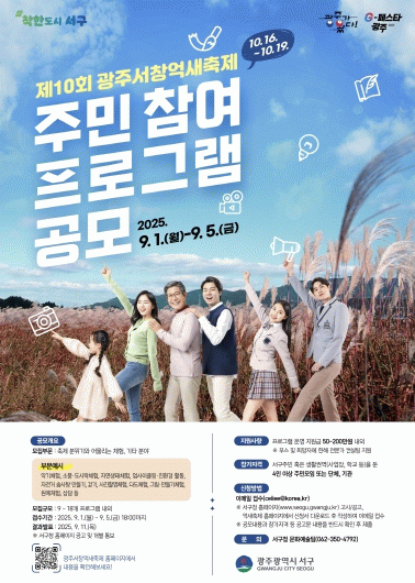 주민참여 프로그램 공모는 9월5일까지 진행되며 서구에 주소를 두거나 생활권을 둔 4인 이상의 모임‧단체‧기관 누구나 신청할 수 있다. 모집 분야는 악기, 다도, 원예, 사진, 업사이클링, 반려견 모임 등 다양한 체험활동과 창의적 아이디어 모두 가능하다. 심사는 대표성, 창의성, 대중성, 연계성, 가능성을 기준으로 이뤄진다.