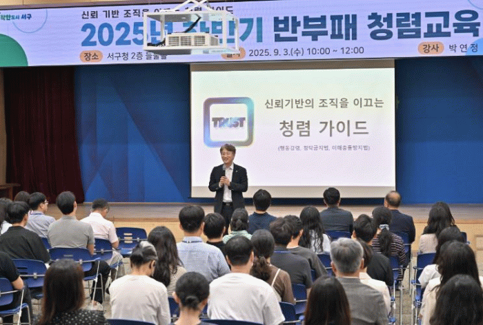한편 서구는 모바일 청렴 소통 채널 ‘청렴깨끗톡’을 통해 매월 청렴 제도 소개와 실시간 상담 서비스를 제공하고 있으며 다양한 청렴 캠페인과 교육 프로그램을 병행해 청렴 문화 확산에 힘쓰고 있다.
