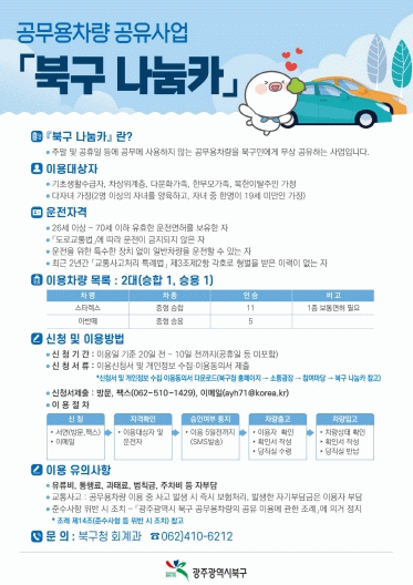 신청 방법은 차량 이용 희망일로부터 20일~10일 전까지 신청서 및 개인정보 수집·이용 동의서 등을 작성해 북구청 회계과에 서면(방문, 팩스) 또는 이메일로 제출하면 된다.