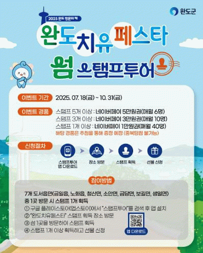 참여 대상은 완도군 외 타 지역에 주소지를 두고 있는 관광객으로 핸드폰에 ‘스탬프 투어’ 앱을 설치한 후 ‘완도 치유 페스타 섬 스탬프 투어’를 선택해 참여하면 된다.