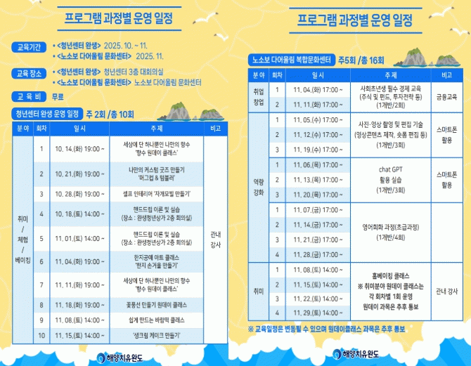 청년센터 완생(완도읍 군내길 7)에서는 ▲향수 만들기 ▲머그컵·텀블러 굿즈 제작 ▲바리스타 체험 ▲생크림 케이크 만들기 등 청년 맞춤형 원데이 클래스와 취미·체험 프로그램이 운영된다.