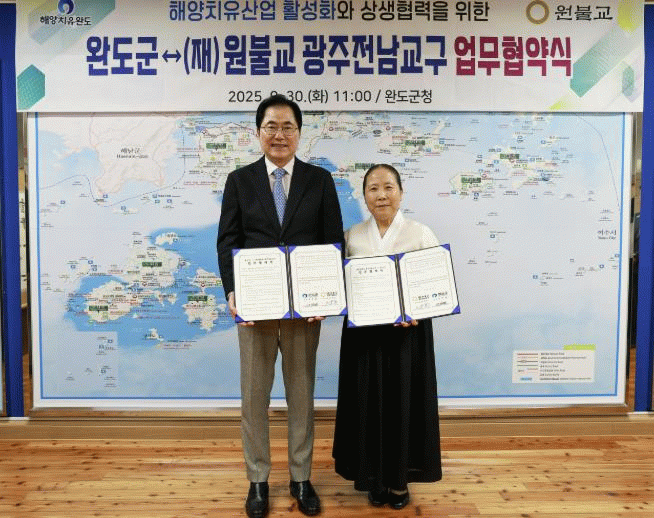협약의 주요 내용은 ▲완도 해양치유산업 발전을 위한 지속적인 교류 ▲(재)원불교 광주전남교구 소속 교무, 교도의 복지 향상 및 이용료 할인 혜택 제공 ▲해양치유 시설 연계 다양한 행사, 워크숍, 교육, 회의 등 장소 활용 ▲완도 해양치유산업 홍보를 위한 해양치유 프로그램 운영에 대한 협조 체계 구축 등이다.