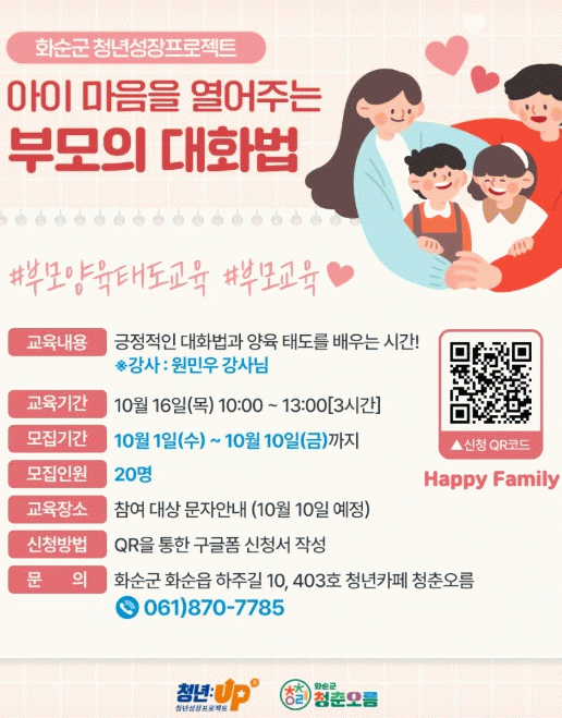 조미화 인구청년정책과장은 “부모님의 양육 태도를 객관적으로 진단하고, 자녀와의 관계를 발전시킬 방법을 함께 고민하는 맞춤형 프로그램을 통해 긍정적인 관계 형성에 큰 기대가 된다”라고 전했다.