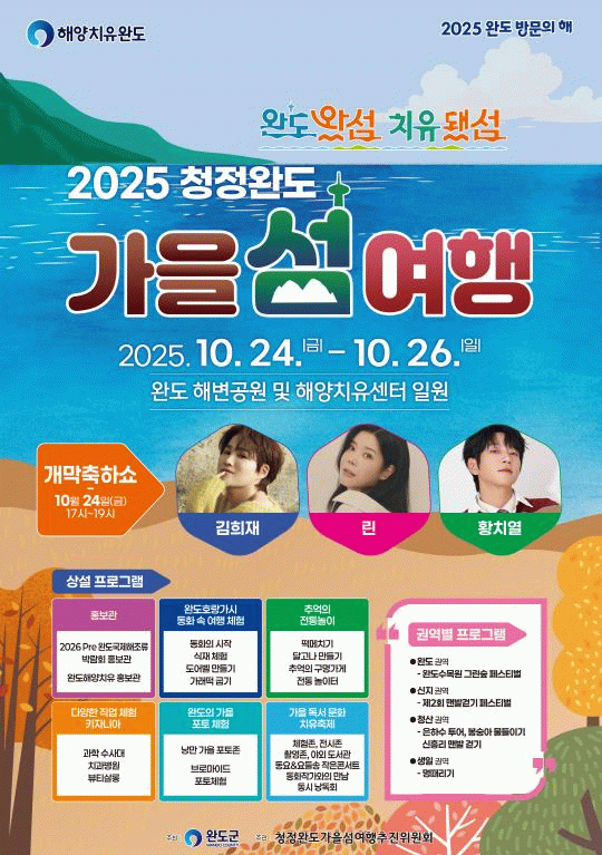 올해 행사의 주제는 ‘완도왔섬 치유됐섬’이며, 청정한 자연환경과 해양치유 등 완도만의 자원을 기반으로 심신을 치유할 수 있는 다채로운 프로그램이 준비됐다.