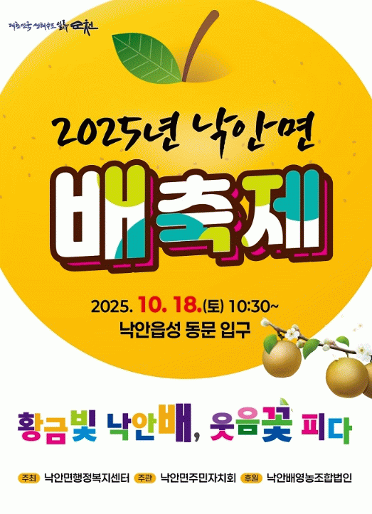 낙안면 관계자는 “이번 배축제는 주민이 주도적으로 기획하고 참여하는 진정한 ‘주민축제’로, 지역 특산물인 낙안배의 우수성을 널리 알리고 지역공동체의 화합을 다지는 계기가 될 것” 이라며 많은 관심과 참여를 당부했다.